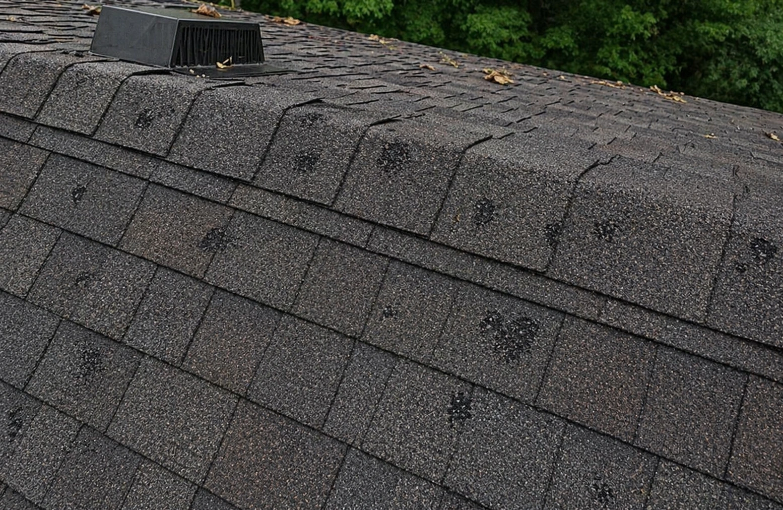- Granule Loss: Areas where the protective ceramic granules have been violently stripped away, exposing the black asphalt beneath.